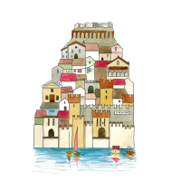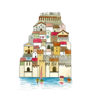 Un’illustrazione originale firmata Valentina Torboli Rapetti, che cattura l’essenza di Sirmione, trasformando l’iconico borgo lacustre in un microcosmo poetico e immaginifico.
