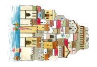 Un’illustrazione originale firmata Valentina Torboli Rapetti, che cattura l’essenza di Sirmione, trasformando l’iconico borgo lacustre in un microcosmo poetico e immaginifico.