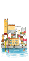 Un’illustrazione originale firmata Valentina Torboli Rapetti, che cattura l’essenza di Malcesine, trasformando l’iconico borgo lacustre in un microcosmo poetico e immaginifico.