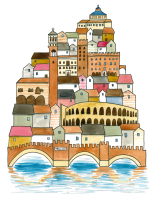 Un’illustrazione originale firmata Valentina Torboli Rapetti, che cattura l’essenza di Verona, trasformando l’iconica città in un microcosmo poetico e immaginifico.
