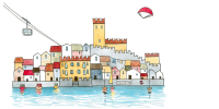 Un’illustrazione originale firmata Valentina Torboli Rapetti, che cattura l’essenza di Malcesine, trasformando l’iconico borgo lacustre in un microcosmo poetico e immaginifico.