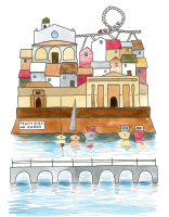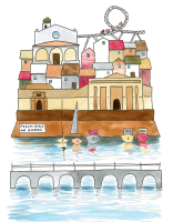 Un’illustrazione originale firmata Valentina Torboli Rapetti, che cattura l’essenza di Peschiera, trasformando l’iconico borgo lacustre in un microcosmo poetico e immaginifico.