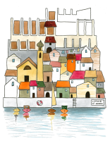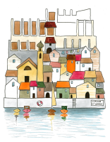 Un’illustrazione originale firmata Valentina Torboli Rapetti, che cattura l’essenza di Limone sul Garda, trasformando l’iconico borgo lacustre in un microcosmo poetico e immaginifico.