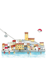 Un’illustrazione originale firmata Valentina Torboli Rapetti, che cattura l’essenza di Malcesine, trasformando l’iconico borgo lacustre in un microcosmo poetico e immaginifico.