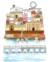 Un’illustrazione originale firmata Valentina Torboli Rapetti, che cattura l’essenza di Peschiera, trasformando l’iconico borgo lacustre in un microcosmo poetico e immaginifico.