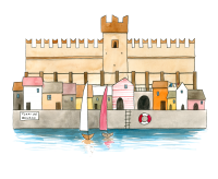 Un’illustrazione originale firmata Valentina Torboli Rapetti, che cattura l’essenza di Torri del Benaco, trasformando l’iconico borgo lacustre in un microcosmo poetico e immaginifico.