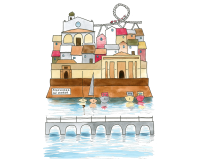 Un’illustrazione originale firmata Valentina Torboli Rapetti, che cattura l’essenza di Peschiera del Garda, trasformando l’iconico borgo lacustre in un microcosmo poetico e immaginifico.