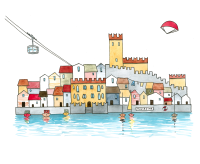 Un’illustrazione originale firmata Valentina Torboli Rapetti, che cattura l’essenza di Malcesine sul Garda, trasformando l’iconico borgo lacustre in un microcosmo poetico e immaginifico.