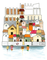 Un’illustrazione originale firmata Valentina Torboli Rapetti, che cattura l’essenza di Limone, trasformando l’iconico borgo lacustre in un microcosmo poetico e immaginifico.