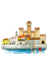 Un’illustrazione originale firmata Valentina Torboli Rapetti, che cattura l’essenza di Lazise, trasformando l’iconico borgo lacustre in un microcosmo poetico e immaginifico.