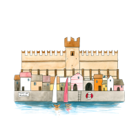 Un’illustrazione originale firmata Valentina Torboli Rapetti, che cattura l’essenza di Torri del Benaco, trasformando l’iconico borgo lacustre in un microcosmo poetico e immaginifico.