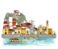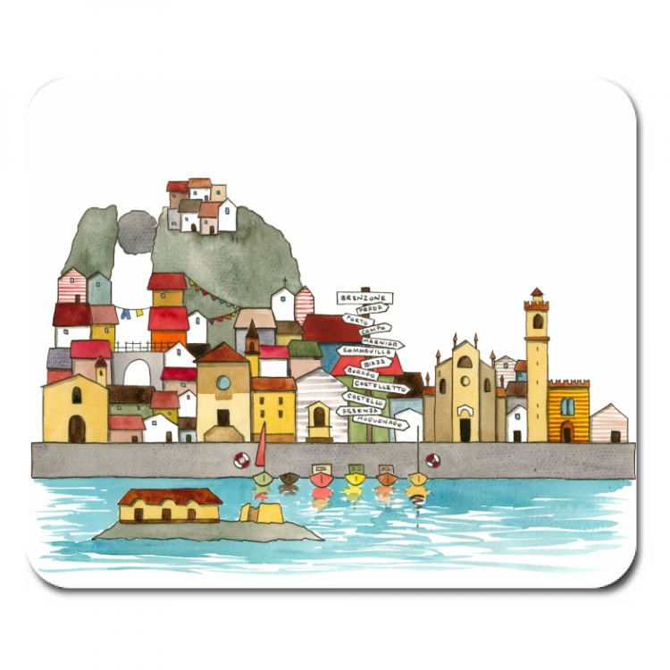 Un’illustrazione originale firmata Valentina Torboli Rapetti, che cattura l’essenza di Brenzone, trasformando l’iconico borgo lacustre in un microcosmo poetico e immaginifico.